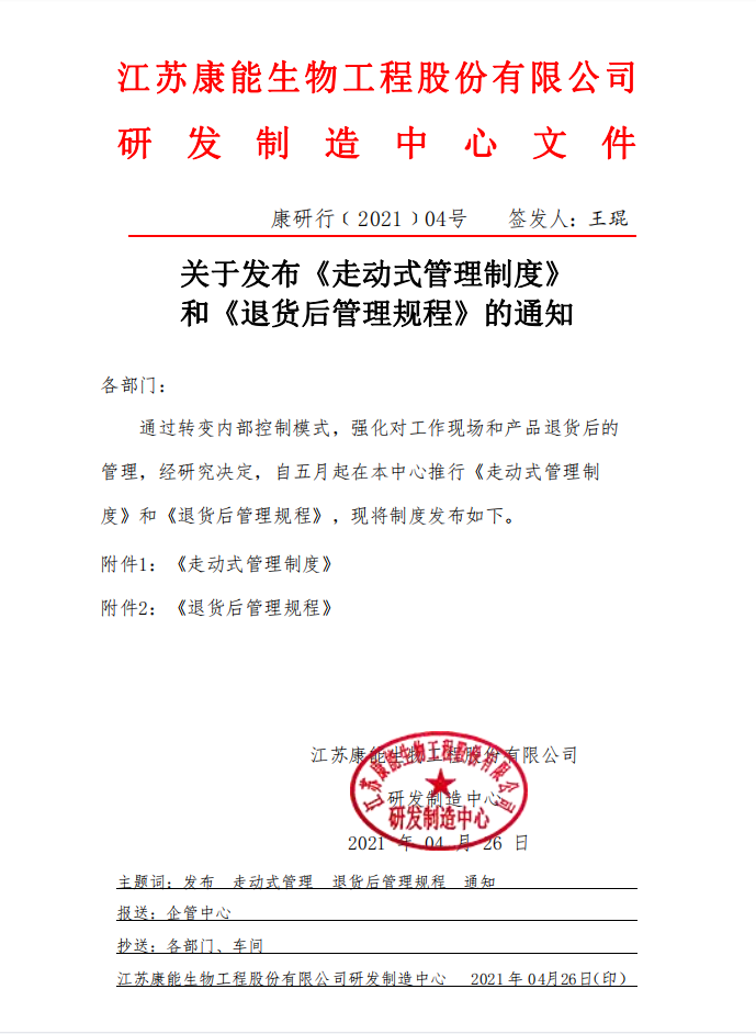 2021年4月26日公司发布“走动式管理制度”,要求自5月1日起各部门、车间、班组按制度要求执行走动式管理。动态管理是过程控制的重要手段,只有及时发现影响质量的因素,及时整改,提高产品质量的稳定性,才能真正达到“管理零距离,工作无死角”,让管理向标准化、规范化、专业化更进一步。
